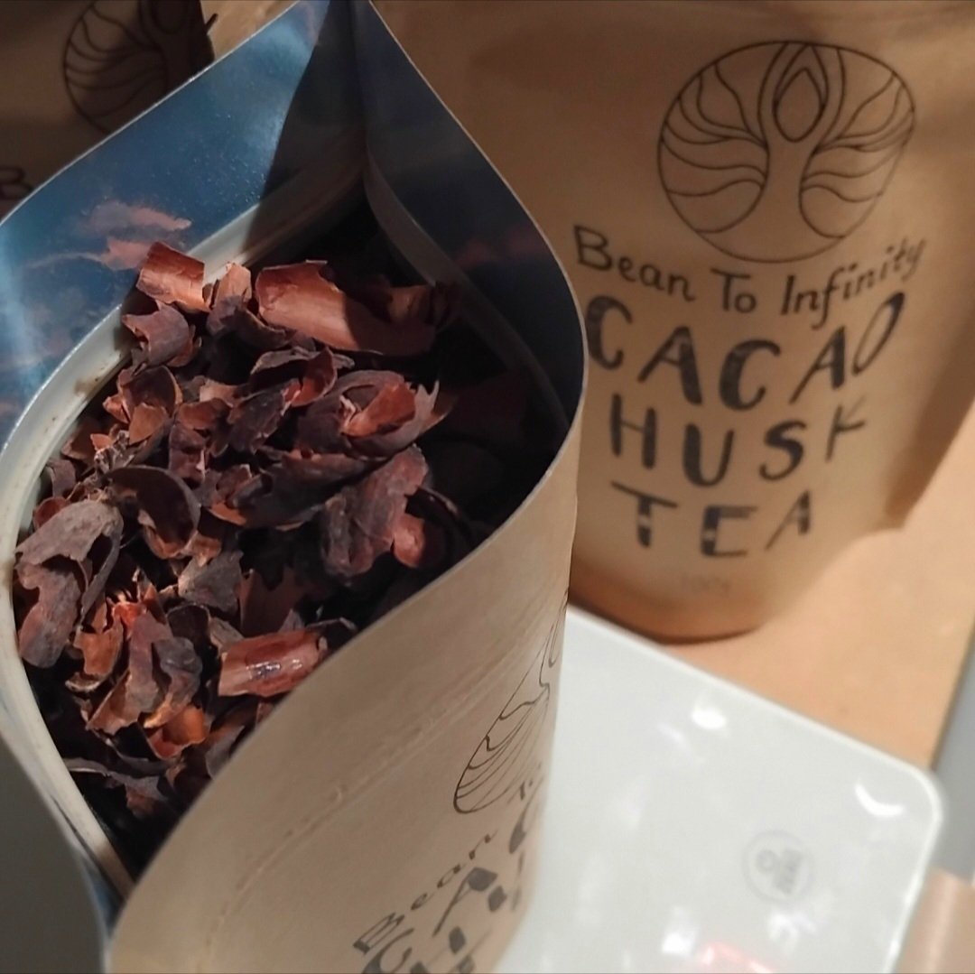 Contains : 100g of cacao husk tea, beautifully packaged in a resealable home compostable bag.